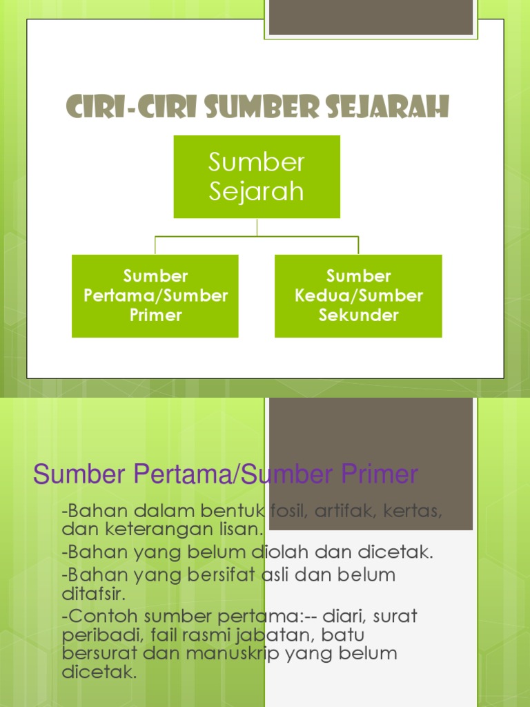 Suatu sumber primer dapat menjadi sumber sekunder dan begitu pula sebaliknya tergantung bagaimana seseorangpengguna menggunakannya. Sumber Sejarah 1. Sumber-sumber tersebut biasanya dihasilkan pada masa yang.
